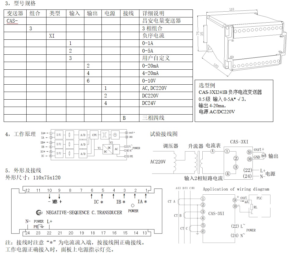 CAS系列負序電量變送器是采集系統三相電流、電壓信號,計算出線路中的負序電流或電壓量,再轉換成按線性比例輸出直流電流、電壓并隔離的設備,配以相應的指示儀表或裝置是電力系統、遠動裝置、自動化控制系統等的模擬量采集模塊。執行標準GB/T13850.1-92