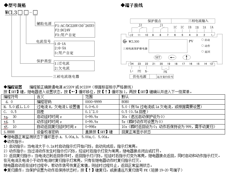 WCL300三相電流繼電器,適用于高壓35kv,10kv或低壓400v線路、電動機及其他用電設備,作為三相電流檢測及控制設備。且具備啟動延時(用作電動機保護)、延時動作、返回延時等功能,檢測精度高,是高低壓系統及電動機簡便可靠的三相電流繼電保護。