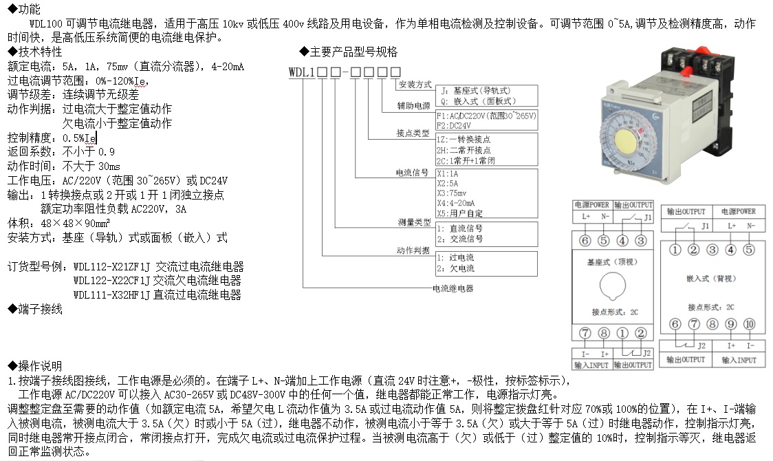 WDL100可調節電流繼電器,適用于高壓10kv或低壓400v線路及用電設備,作為單相電流檢測及控制設備。可調節范圍0~5A,調節及檢測精度高,動作時間快,是高低壓系統簡便可靠的電流繼電保護。