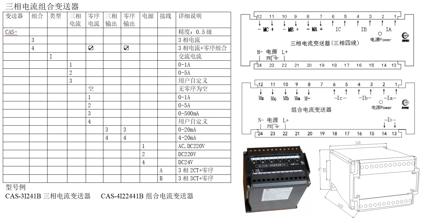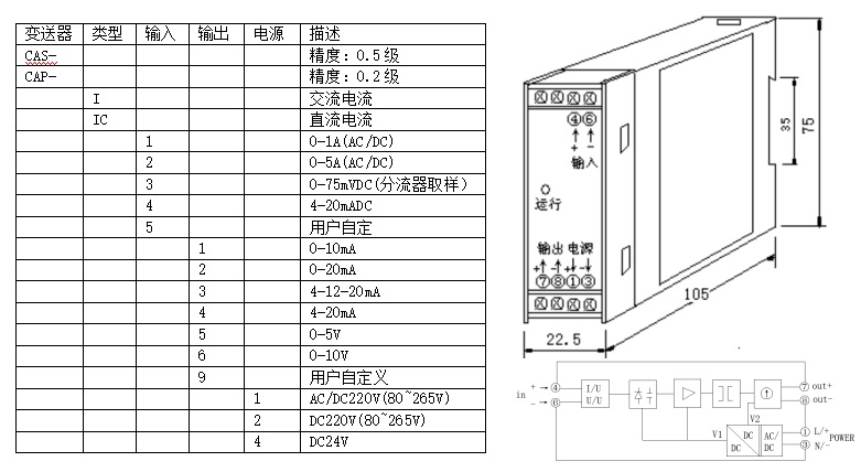 CAS系列電量變送器是將被測交直流電流、電壓等信號轉換成按線性比例輸出直流電流、電壓并隔離的設備,配以相應的指示儀表或裝置是電力系統、遠動裝置、自動化控制系統等可選擇的模擬量采集模塊。執行標準GB/T13850.1-92