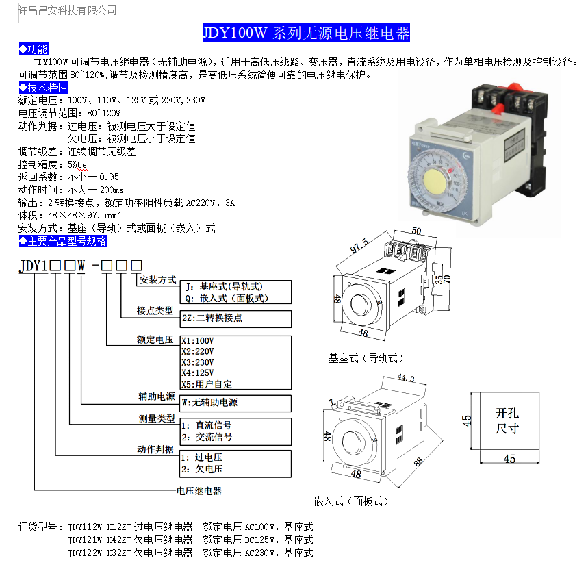 JDY100W可調(diào)節(jié)電壓繼電器(無輔助電源),適用于高低壓線路、變壓器,直流系統(tǒng)及用電設(shè)備,作為單相電壓檢測及控制設(shè)備??烧{(diào)節(jié)范圍80~120%,調(diào)節(jié)及檢測精度高,是高低壓系統(tǒng)簡便可靠的電壓繼電保護(hù)。